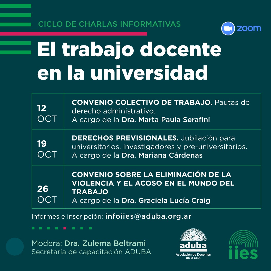 El trabajo docente en la Universidad: Convenio Colectivo de Trabajo. Dra Marta Paula Serafini By Secretaria IIESSin categoría El trabajo docente en la Universidad: Derechos Previsionales. Dra. Mariana Cárdenas By Secretaria IIESSin categoría Entrevista en el programa de la Unidad de Promoción de Calidad de la UBA «Aula Abierta» a la directora del IIES/ADUBA/UBA By Secretaria IIESSin categoría Ciclo de charlas sobre trabajo docente en la universidad By Secretaria IIESSin categoría Autoridades de ADUBA y el IIES se reunieron con Fernando Peirano, presidente de la Agencia I+D+i By Secretaria IIESSin categoría Clase final de la Cátedra Libre de Soberanía Alimentaria CALISA Nutrición By Secretaria IIESSin categoría La revista Campo Universitario ya se encuentra en Latindex Catálogo By Secretaria IIESSin categoría Ya está disponible el cuarto número de Campo Universitario By Secretaria IIESSin categoría Ricci y Gorban presentaron el curso sobre soberanía alimentaria By prensaSin categoría Jornada sobre accesibilidad By Secretaria IIESSin categoría Paginación de entradas Anteriores 1 … 6 7 8 … 10 Siguientes